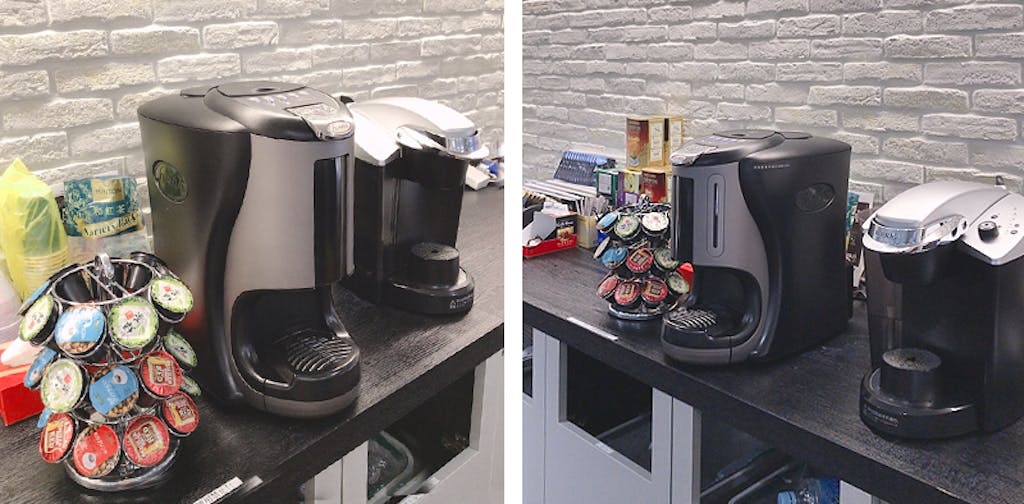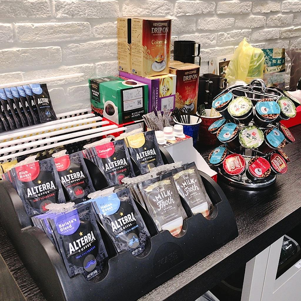 奥のフロアには、飲み放題のコーヒーメーカーが設置してあります。コーヒーだけではなく、いろんな紅茶や緑茶などが楽しめるので、みんなの憩いの場になっています。